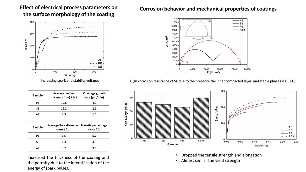 - The SE sample had a higher corrosion resistance due to its relatively thick coating, dense structure, and stable phase (Mg2SiO4).